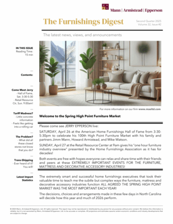 The proprietary data interpretation in The Furnishings Digest ensures that MAE remains closely connected with industry leaders and participants. The firm coordinates data with industry associations and governmental sources to uphold research accuracy and integrity.